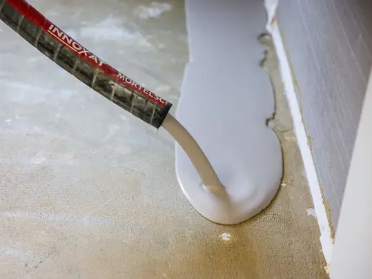 Extra aandacht is geboden bij de renovatie van een bestaande vloer. Wil je hierop een dampdichte vloerbedekking aanbrengen, controleer dan vóór het egaliseren of er nog oude, vochtgevoelige lijmresten aanwezig zijn. Is dit het geval, schuur, frees of schaaf de bestaande toplaag dan volledig weg en breng hierop een vochtscherm aan. Dit doe je met 021 Euroblock Reno LE, 023 Euroblock Fast of