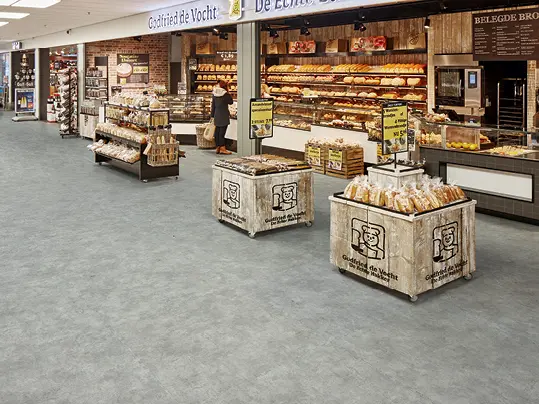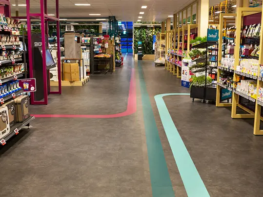Med materialer som homogen vinyl, LVT og linoleum kan vi tilbyde skræddersyede supermarkedsgulve, der kombinerer høj slidstyrke, stabilitet og lang levetid. Gulvene er lette at rengøre og modstandsdygtige over for spild, hvilket gør dem velegnede til områder som indgangspartier, kølezoner, delikatesseafdelinger og kasselinjer.