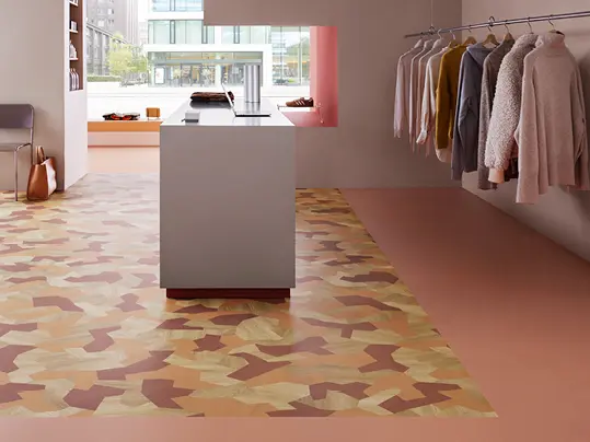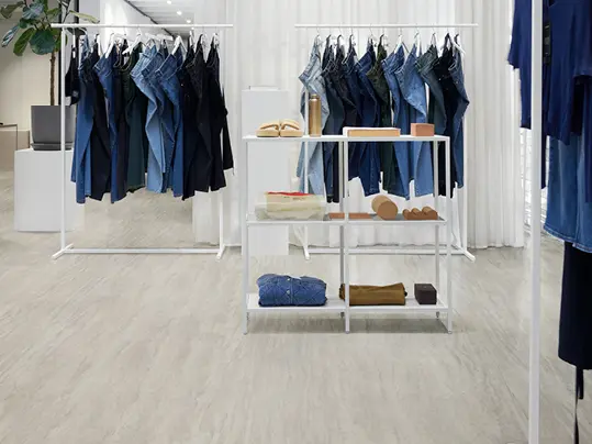 Vores sortiment gør det muligt at arbejde med farver, teksturer, zonering og unikke designudtryk, så gulvet kan tilpasses alt fra nye kollektioner til layoutændringer. Samtidig er materialerne robuste nok til at modstå daglig slidtage og hyppige ændringer i butikskonceptet – uden at gå på kompromis med æstetikken.
