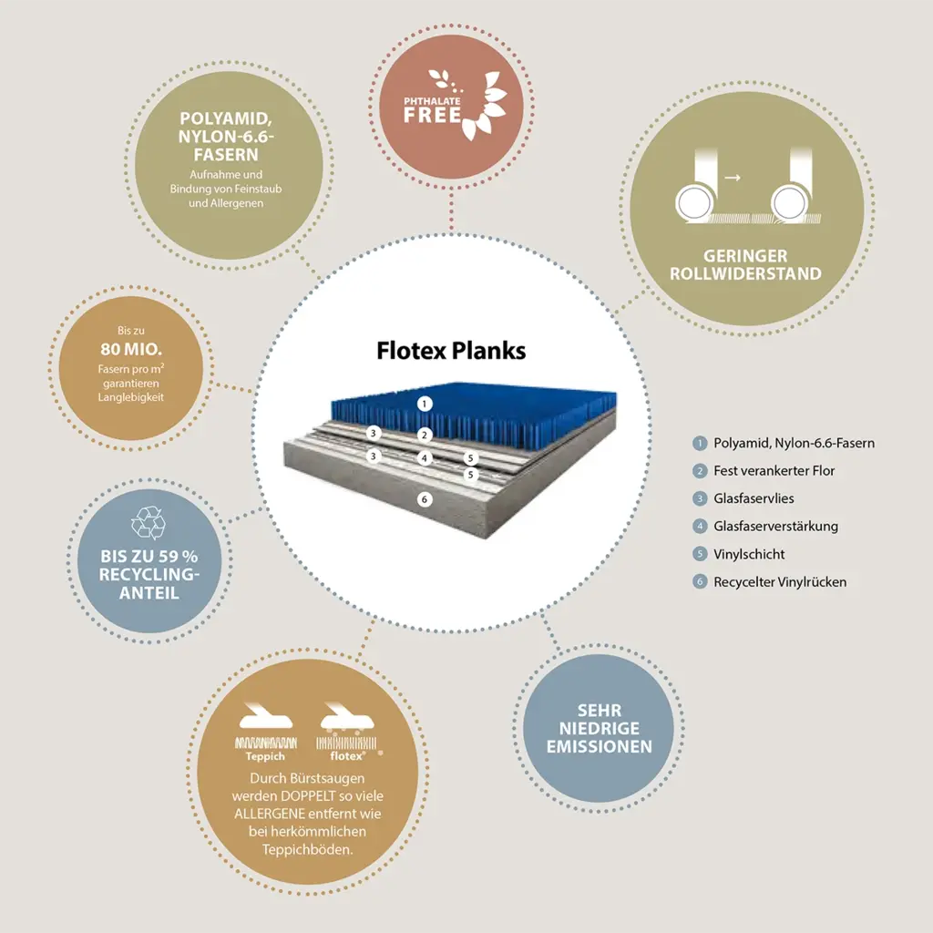 Flotex steht für die nächste Generation moderner Bodenbeläge – eine leistungsstarke Oberfläche, die Langlebigkeit, Komfort und Ästhetik vereint. Durch die robuste Konstruktion bietet Flotex langfristige Strapazierfähigkeit – selbst in stark frequentierten Bereichen – und überzeugt zusätzlich mit einem angenehm ruhigen Begehkomfort.