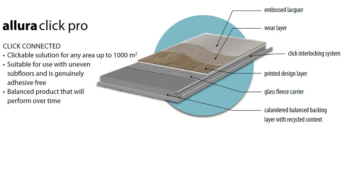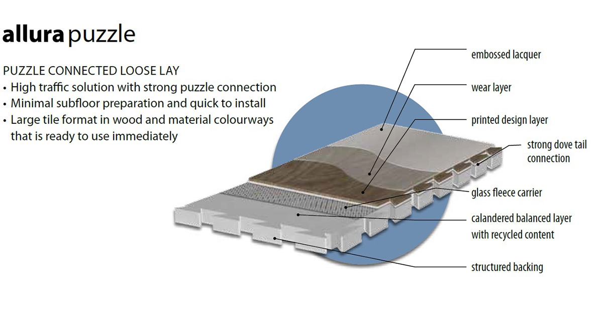Allura Puzzle is offered in puzzle shape tiles of 96x96 cm with a 0.7 mm wear layer and a total thickness of 5 mm.
