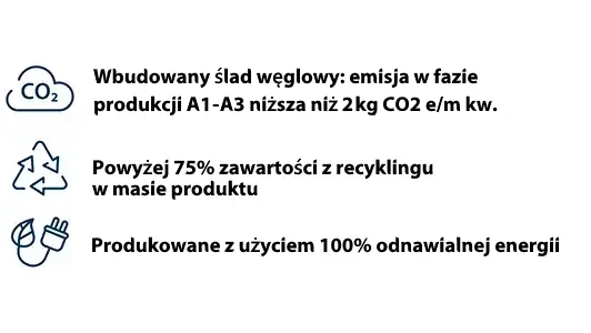Rozwijając dalej tą standardową konstrukcję płytek dywanowych, Forbo Flooring Systems jeszcze bardziej udoskonaliło zgodność nowych kolekcji płytek dywanowych z kryteriami zrównoważonego rozwoju, dzięki zwiększeniu zawartości materiałów pochodzących z recyklingu i znacznemu obniżeniu emisji wbudowanego dwutlenku węgla podczas fazy produkcji (A1-A3). Wszystko to bez kompensacji i zweryfikowane przez Deklaracje Środowiskowe Produktu (EPD).
