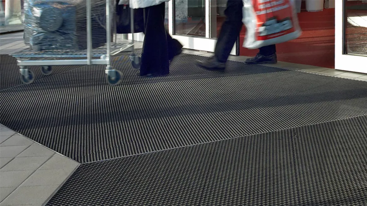 Maty wejściowe stosowane w głównych wejściach usuwają brud i wilgoć z podeszew butów oraz kół pojazdów, zapewniając czystą, schludną i bezpieczną strefę powitalną dla gości.