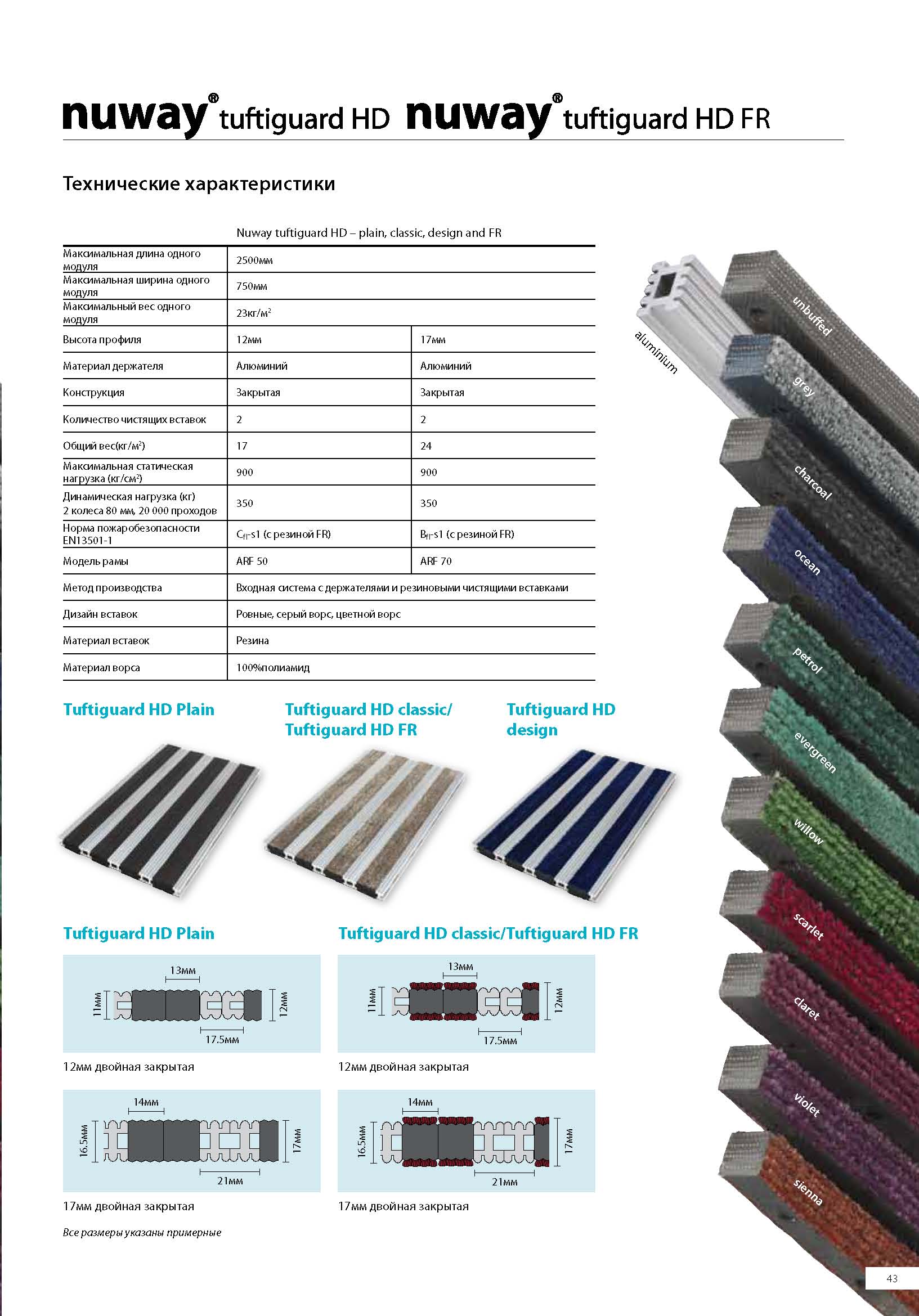 Предлагается 9 цветных чистящих вставок для дизайна входной зоны. Tuftiguard HD поставляется только с двойными чистящими вставками для эффективного удаления влаги с подошв обуви.