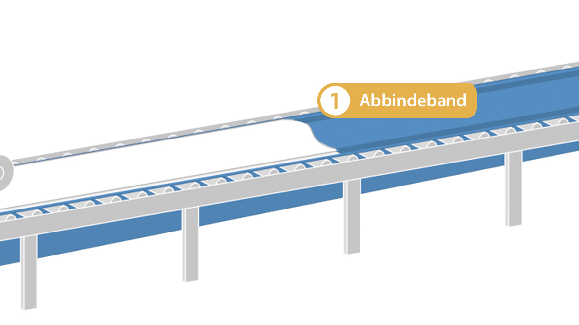 Dem sensitivsten Band im gesamten Produktionsprozess kommt gleichzeitig die größte Bedeutung zu: dem Abbindeband. Dieses Prozessband bildet den Anfang und gleichzeitig das Herzstück in der Produktion. Auf ihm wird das feuchte Gipsgemisch zwischen zwei Kartonlagen als flacher, endloser Strang geformt und ausgehärtet.