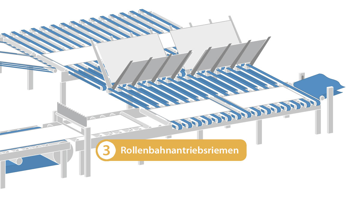 Angetriebene Rollenbahnförderer sind beim Transport der produzierten Platten nicht wegzudenken. Die eingesetzten Rollenbahnantriebsriemen in diesem Prozessschritt müssen schnell, verlässlich und wirtschaftlich arbeiten.